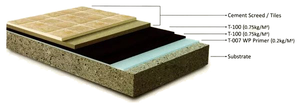 Two coats of PENTENS T-100 are recommended for complete waterproofing (1kg/m2 per coat).