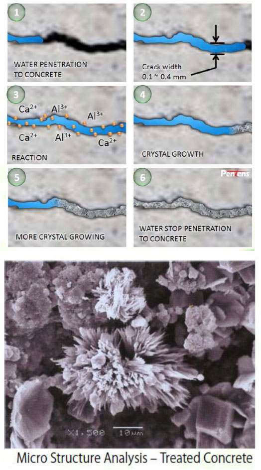 Pentens T-308 is added to batches of concrete during the mixing process for new construction projects. The highgrowth organic component of the product reacts with water and unhydrated particles in concrete to form millions of needle-like crystals. These crystals grow and migrate through the concrete to fill in hair-thin pores and microscopic voids up to 0.4mm that would otherwise serve as passages for harmful moisture.